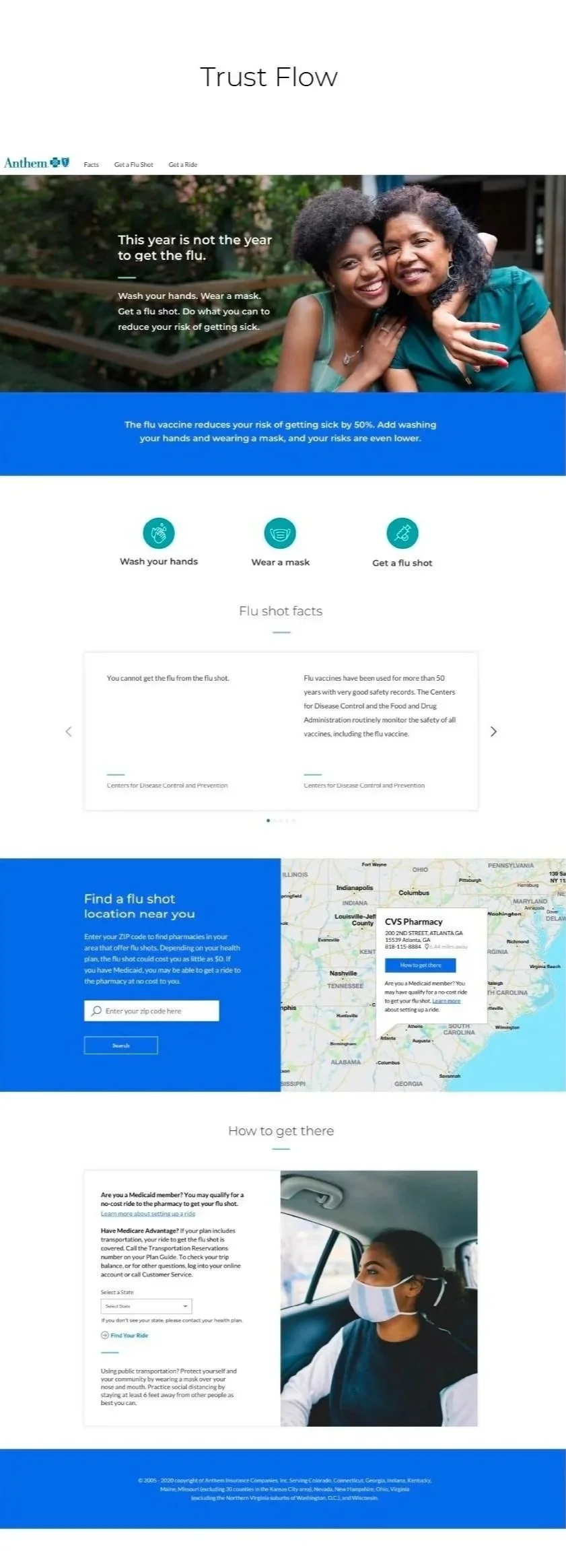 Access was found from our research into what older Hispanic and Latinx members generally were concerned with. In this case, easy access to the right tools, and a trusting face. One of the founders of the NHMA (National Hispanic Medical Association) Dr. Elena Rios is pivotal in the creating that level of trust for flu shot vaccination. For access, we arranged the landing page to show where you can find the nearest location, and access the best mode of transportation to get there.